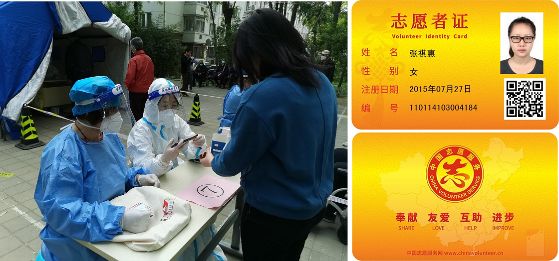 2022年4月北京再次出现疫情,此次疫情“传播快、范围广”,北京多次施行全员核酸,政府压力难以想象,因此,我与常居地的昌平区天南街道天通苑东一区居委联系,志愿加入了北京抗疫志愿者团队,以尽绵薄之力。在抗议期间,参与核酸筛查工作,负责登记居民信息、解答居民关于核酸检测相关问题、维护现场秩序等。