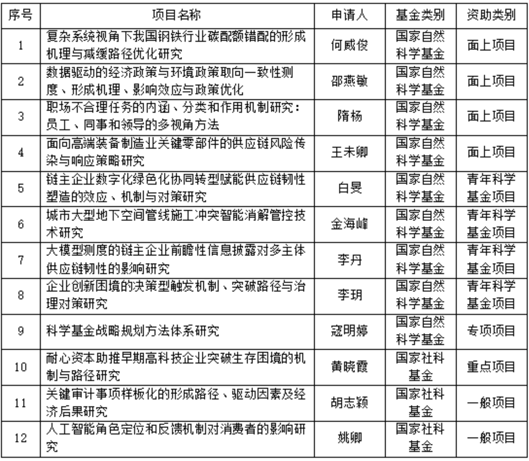 近日,国家自然科学基金委员会和全国哲学社会科学工作办公室分别公布了2025年度国家自然科学基金和国家社科基金集中申报评审结果。学院获批合计12项。其中,国家自然科学基金获批9项,包含面上项目4项、青年科学基金4项和专项项目1项,直接经费合计312万元;国家社科基金获批3项,包含重点项目1项和一般项目2项,经费合计75万元。具体立项情况如下: