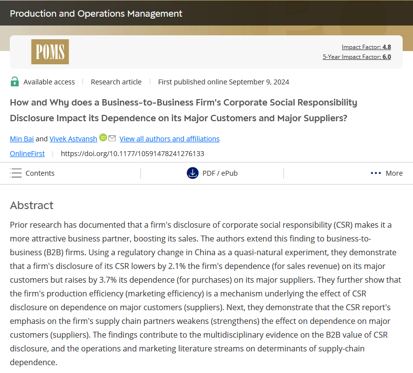 我院教师白旻在UTD24列表期刊Production and Operations Management发表最新研究成果